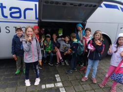 Bevor es anschließend ins Hallenbad Pohlheim ging, gab es noch eine sehr ungewöhnliche Mittagspause. Damit die Gruppe wenigsten trocken essen könnte, hatten die Busfahrer eine tolle Idee (vielen lieben Dank). Sie öffneten die großen Gepäckladeluken der Busse und ließen die Kinder hineinkriechen. „So eine Mittagspause hatten wir noch nie“, waren sich Leonie, Jannes und Haly einig.