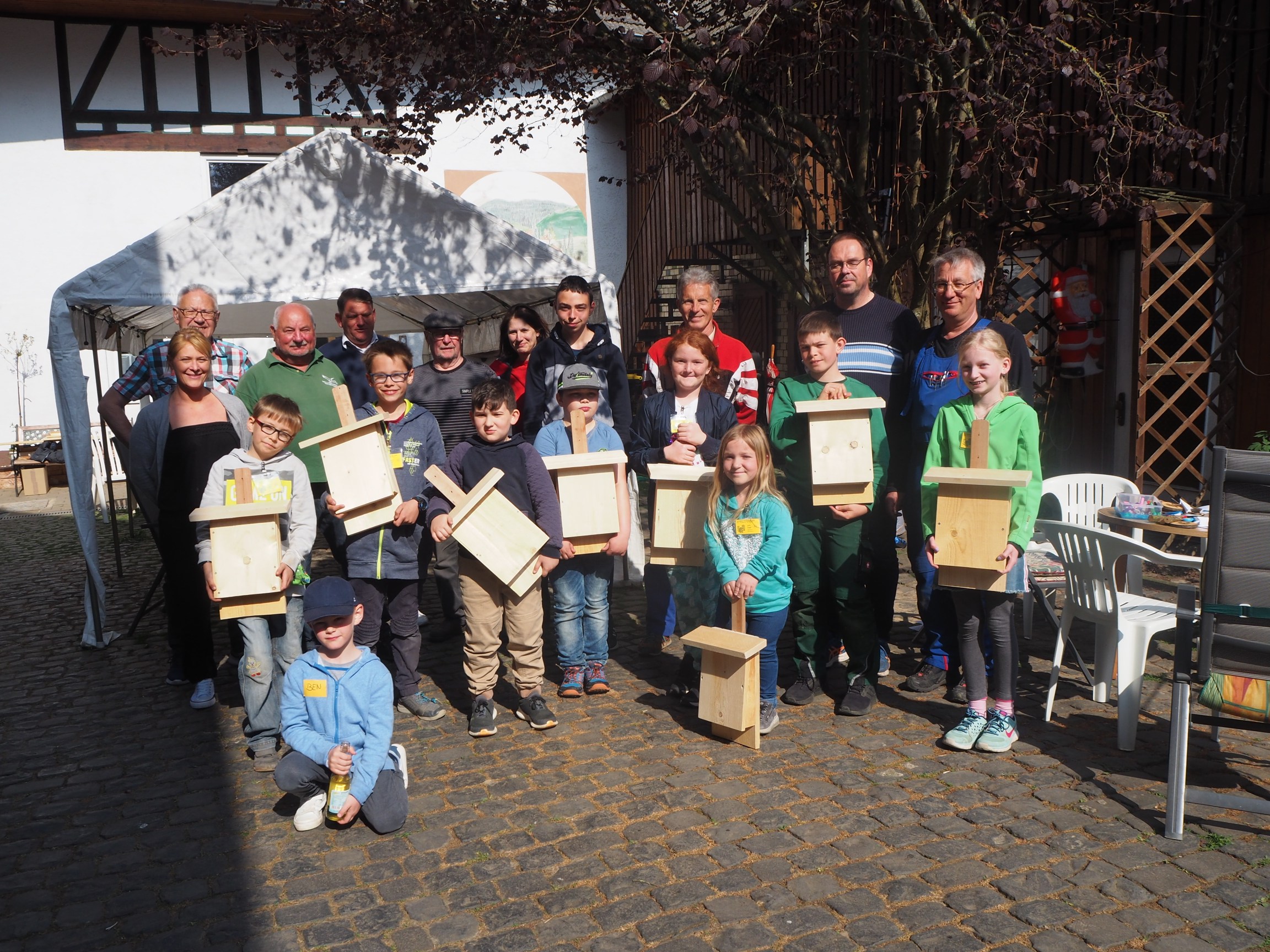 Nach einem gefertigten Muster konnten die Einzelteile von den Teilnehmenden zusammengebaut werden. Diverse Arbeitsschritte waren nötig: Holzteile, hauptsächlich Ecken und Kanten geschliffen, Bohrlöcher angezeichnet und Teile zusammengeschraubt. Akkubohrer- und Akkuschrauber kamen zum Einsatz. Mit viel Eifer waren die Kinder bei der Sache. Zur Stärkung wurden Getränke, Kuchen und Waffeln gereicht. Fledermauszeichnungen auf Papier ausgeschnitten, und entsprechend gefaltet. Außerdem konnten Baumscheiben mit Hasengesichter bemalt werden.