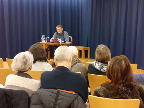 Mit seinen Kürzestgeschichten aus dem Buch "Feuer in der Eiswürfelfabrik" sorgte Martin Ebbertz für jede Menge Gehirnakrobatik bei den Gästen der zweiten Ausgabe der Münzenberger Lesungs-Reihe „Blaue Stunde“. Was passiert, wenn in einer Eiswürfelfabrik ein Feuer ausbricht? Oder wenn eine Familie eine Bootstour auf dem Meer macht – in einer Bucht, in der Haie leben? Und was hat ein Ordnungsamt mit der Ordnung im Kinderzimmer zu tun? Fragen über Fragen! Der Frankfurter Autor Martin Ebbertz beantwortete sie alle. Und noch einige mehr. Die kürzeste Kürzestgeschichte, die Ebbertz je geschrieben hat, durfte in der Lesung natürlich nicht fehlen. Sie war genau einen Satz lang. Seine witzigen, manchmal auch nachdenklichen oder gemeinen Kürzestgeschichten kamen beim Publikum gut an. Die nächste Ausgabe der „Blauen Stunde“ findet am Sonntag, 28.01.24 um 16 Uhr im Kulturhaus Alte Synagoge statt. Barbara Molitor lädt mit ihrem Buch „Fortunas Tor“ zu einer Zeitreise ins Mittelalter ein.