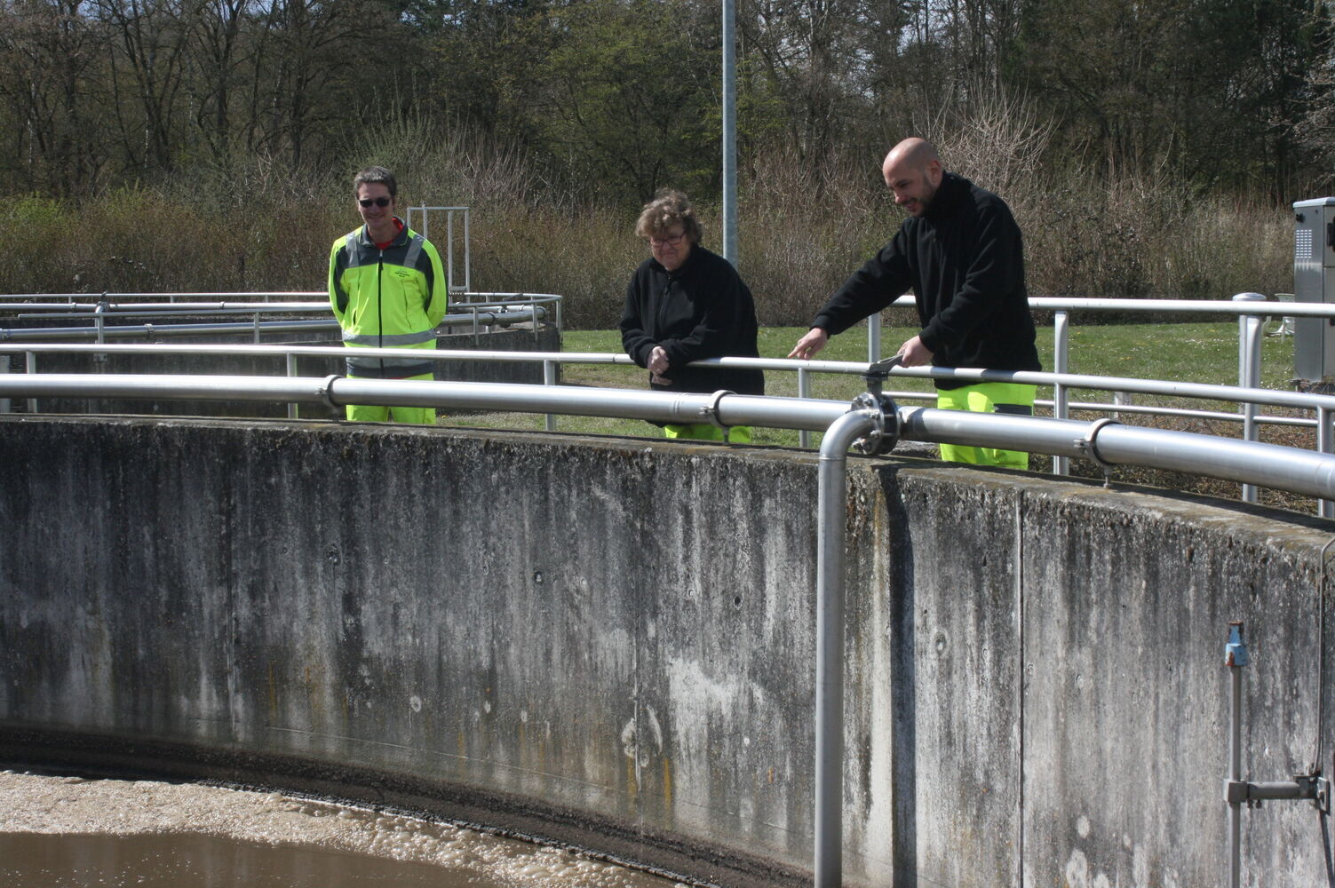 Dirk Friedrich, Doris Petry und Nils Brucker (von links) sind mit dem Blubbertest zufrieden. Die neue Technik in der Gambacher Kläranlage läuft optimal.