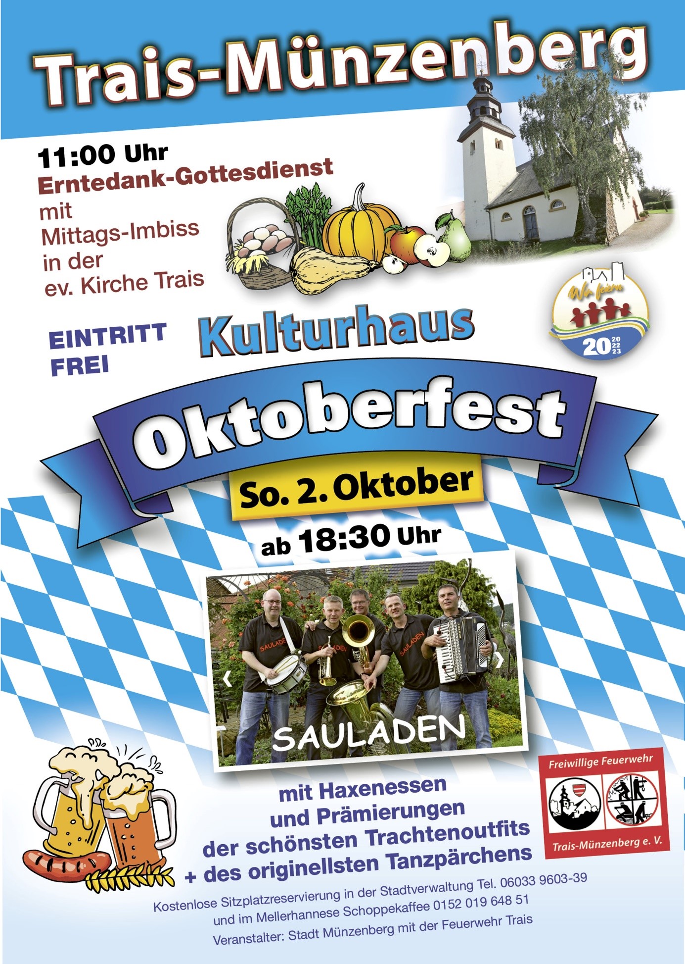Ab 18.30 Uhr startet im und um das Traiser Kulturhaus ein zünftiges Oktoberfest samt original Biergarten und den berühmten Haxen der Traiser Feuerwehr. Die Kapelle „Sauladen“ sorgt für die nötige Gaudi. Die schönsten Trachten-Outfits der Gäste und das originellste Tanzpärchen des Oktoberfests werden prämiert.