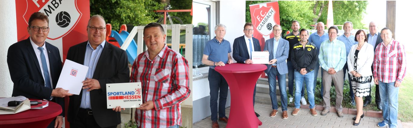 Bei bestem Wetter herrscht am Freitag, 13.05.22 beim Gambacher FC Spielbetrieb wie immer. Die B-Juniorinnen des FC schlagen die Mannschaft des SVP Fauerbach mit 2:1. Nichts Ungewöhnliches also. Und doch hat parallel zum Spiel die Zukunft des Münzenberger Fußballs am Vereinsheim des FC Gambach begonnen. Stefan Sauer, Staatssekretär im Hessischen Ministerium des Innern und für Sport, war eigens aus der Landeshauptstadt angereist um einen Förderbescheid aus dem Förderprogramm „Vereinseigener Sportstättenbau“ in Höhe von mehr als 150.000 € zu überreichen. Mit der Landeszuweisung unterstützt die Hessische Landesregierung den Umbau des Hartplatzes in einen modernen Kunstrasenplatz.
