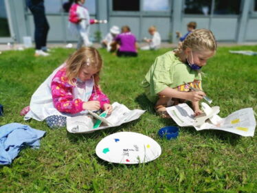Nach der Frühstückspause wurde gestern vor und hinter den Dorfgemeinschaftshäusern der Stadt Münzenberg eifrig geschmirgelt, geklebt und gemalt. Aus vorgesägten Laubsägeplatten (Einen herzliche Dank an Franz Schweda, ohne den diese Bastelaktion nicht möglich gewesen wäre!) und jeder Menge Farbe und Fantasie bastelten die Ferienspielkinder tolle 3D-Holzfische und Magnetangeln aus Bambusrohr.