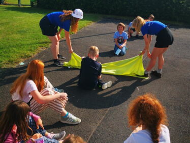 „Auf die Plätze – fertig – los!“ hieß es zu Beginn der zweiten Ferienspielwoche für die Gruppe von Nele, Hannah und Anna, die den Morgen mit dem „Namensduell“ startete. Dabei wurde die Wolldecke fallengelassen und derjenige, der zuerst den Namen seines Gegenübers aussprach, bekam einen Punkt für seine Gruppe. Und das ist gar nicht so leicht. In aller Aufregung vergisst man sogar mal den Namen seines besten Freundes.