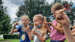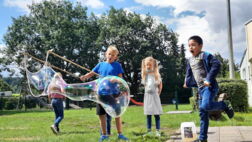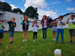 Passanten staunten nicht schlecht, als am Donnerstagvormittag riesige Seifenblasen im Gambacher Park und hinter den Gemeinschaftshäusern in Trais und Ober-Hörgern aufstiegen. Diese waren ein Experiment im Rahmen der Münzenberger Ferienspiele, bei dem die Kinder mit selbstgebauten Seifenblasenmachern kleine und große runde Glitzerkugeln in den Himmel schickten. Vincent und Victoria schafften sogar eine fast 3 Meter lange Blase.