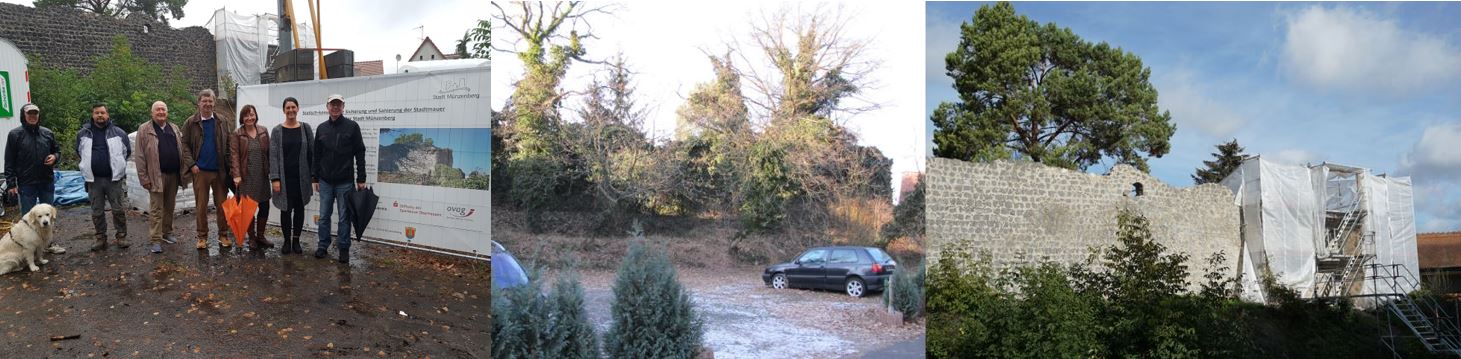 „Statisch-konstruktive Sicherung und Sanierung der Stadtmauer in der Stadt Münzenberg. Dieses Bauvorhaben wird gefördert durch das Land Hessen im Rahmen des Entwicklungsplanes für den Ländlichen Raum 2014-2020, die Deutsche Stiftung für Denkmalschutz, die Stadt Münzenberg, den Freundeskreis Burg und Stadt Münzenberg sowie den Wetteraukreis, die Stiftung Sparkasse Oberhessen und die OVAG.