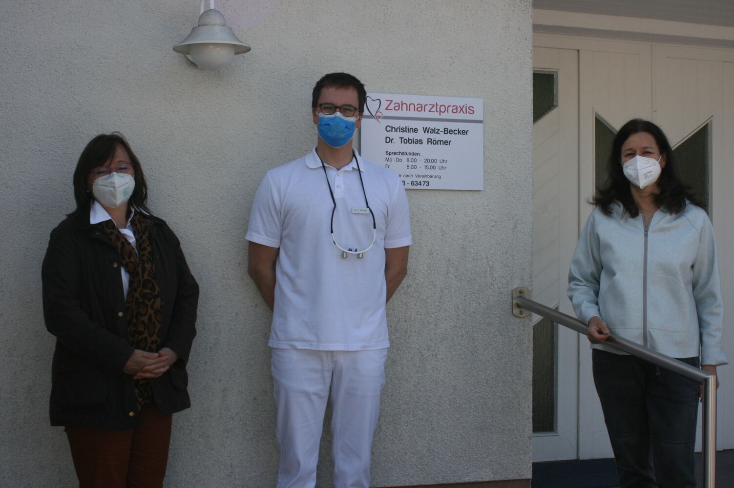 Bürgermeisterin Dr. Isabell Tammer (links) dankte dem Zahnarztpraxis-Team um Dr. Tobias Römer (Mitte) und Christine Walz-Becker (rechts) für ihr Engagement rund um die Einrichtung des Corona-Testzentrums für die Bürgertests. Innerhalb kürzester Zeit konnte so in der Ober-Hörgerner-Straße in Gambach ein Corona Testzentrum für Bürgertests an den Start gehen. Seit Dienstag, 04.05.21 ist das Testzentrum täglich von 8 bis 20 Uhr geöffnet und findet guten Zuspruch. Einer der ersten offiziellen Tests ging übrigens an Bürgermeisterin Dr. Isabell Tammer.
