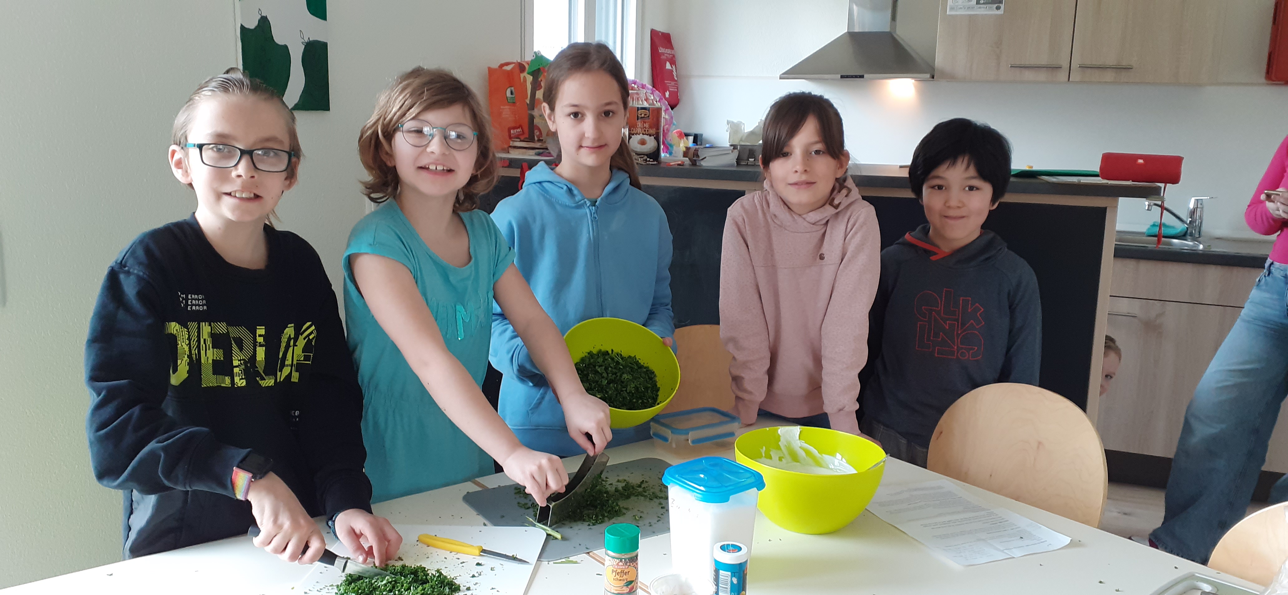 Sieben Kinder, sieben Kräuter – das passte beim Thema „Grüne Soße“ im JUZ Gambach perfekt zusammen. Als erstes galt es die traditionellen Kräuter Pimpinelle, Petersilie, Kresse, Schnittlauch, Borretsch, Sauerampfer und Kerbel zu hacken. Dann ging es ab in die Basissoße aus Schmand und saurer Sahne. Parallel garten Eier und Kartoffel auf dem Herd. Zum Schluss ließen sich es sich die fleißigen jungen Köchinnen und Köche mit ihren OsterFEZ Betreuerinnen Jill und Julia schmecken. „Das war lecker!“ – da waren sich alle einig.