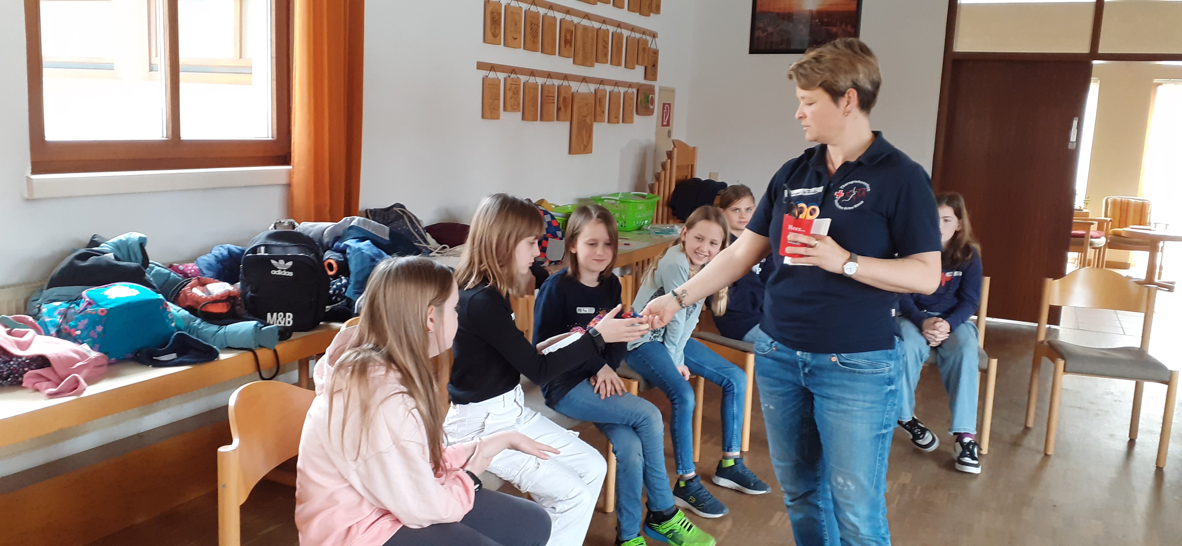 Beim Kurs „Lebensretter“ des DRK Münzenberg drehte sich alles um das Thema Erste Hilfe. Vom Absetzen eines Notrufs über Pflaster kleben, stabile Seitenlage oder Verbände anlegen – Kursleiterin Christina Paulecu machte die 15 jungen Menschen fit für einen potentiellen Einsatz als Lebensretter. Ellen Muth mit ihren drei Betreuungshunden Frieda, Dori und Vinzent sorgte dafür, dass auch die Spiel und Spaß nicht zu kurz kamen.