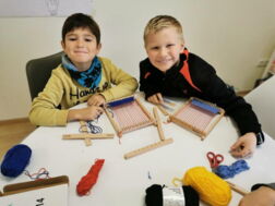 Mit echten kleinen Holzwebrahmen lernten die 12 Kinder innerhalb von zwei Stunden wie man aus bunter Wolle viele tolle Dinge weben kann. Jannes und Lukas hatten schnell raus wie es geht und am Ende fast schon die fliegenden Teppiche für ihre Playmobilfiguren fertiggestellt.