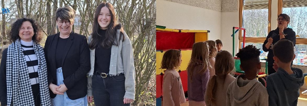 Linkes Bild: Monika Mrozek (links) und Joeline Wirth (rechts) von der Kooperation „Schritt für Schritt“ sind sehr dankbar für die engagierte Zusammenarbeit mit Fortbildnerin Jana Hampel (Mitte) und freuen sich auf weitere gemeinsame Projekte und Fortbildungen. | Rechtes Bild: Mit Spaß und Einfühlungsvermögen konnte Jana Hampel (Mitte) vom mathe-mobil die Kita-Kinder rasch für das Fortbildungsthema „Entdeckerkisten“ begeistern.