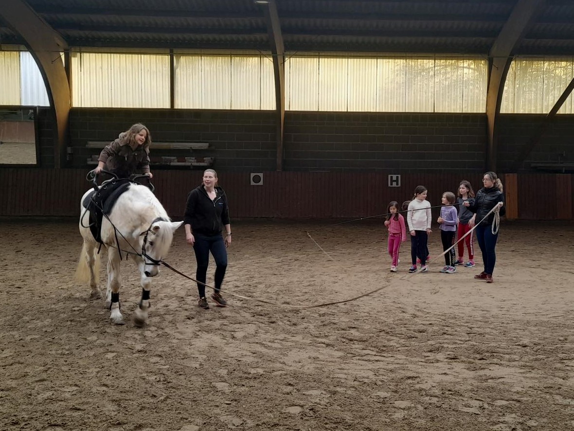 Es folgte eine Aufwärmphase für die Kinder wie auch das Pferd, dann wurden zwei Gruppen gebildet. Die eine Gruppe startete mit Übungen auf dem Holz-Turnpferd, die andere auf dem echten Pferd. Anschließend wurde gewechselt.