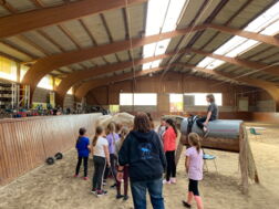Nach einer Kennenlern- und Aufwärmphase für die Kinder wie auch das Pferd, wurden zwei Gruppen gebildet. Die eine Gruppe startete mit Übungen auf dem Holz-Turnpferd, während die andere einem Einblick in Verhalten der Tiere und die Pferdepflege bekam.