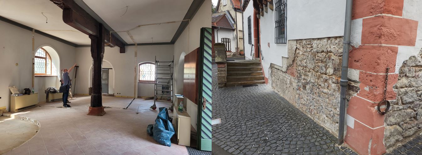 Bild links: Hier steht kein Stein mehr auf dem anderen – die Eingangshalle des historischen Rathauses Münzenberg ist eine einzige Baustelle. Links am Bildrand zu sehen: Der Startpunkt der inzwischen entfernten Holztreppe, dem früheren Aufgang ins erste OG.