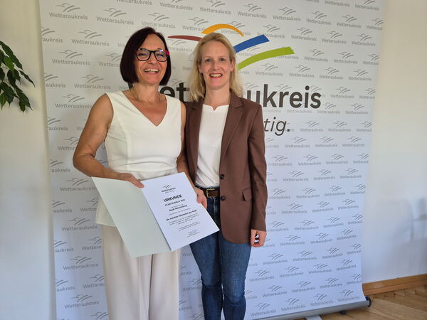 Dank der Radsport-Begeisterung aller Beteiligten hat es Münzenberg gleich bei der ersten Teilnahme beim STADTRADELN im Wetteraukreis auf’s Podium geschafft. Die Stadt mit ihren acht gemeldeten Teams hat den ersten Platz belegt in der Kategorie „Geradelte Kilometer pro Kopf“. Mit rechnerischen 272 geradelten Kilometern pro Kopf hatten die Münzenberger Radfahrerinnen und Radfahrer die Nase vorne. Bürgermeisterin Dr. Isabell Tammer (links) hat bei der Preisverleihung beim Wetteraukreis die Urkunde aus den Händen der ersten Kreisbeigeordneten Birgit Weckler (rechts) entgegengenommen. Auch im nächsten Jahr wird sich Münzenberg am STADTRADELN beteiligen. Die Aktion wird vom 23. Mai bis zum 12. Juni 2026 stattfinden.