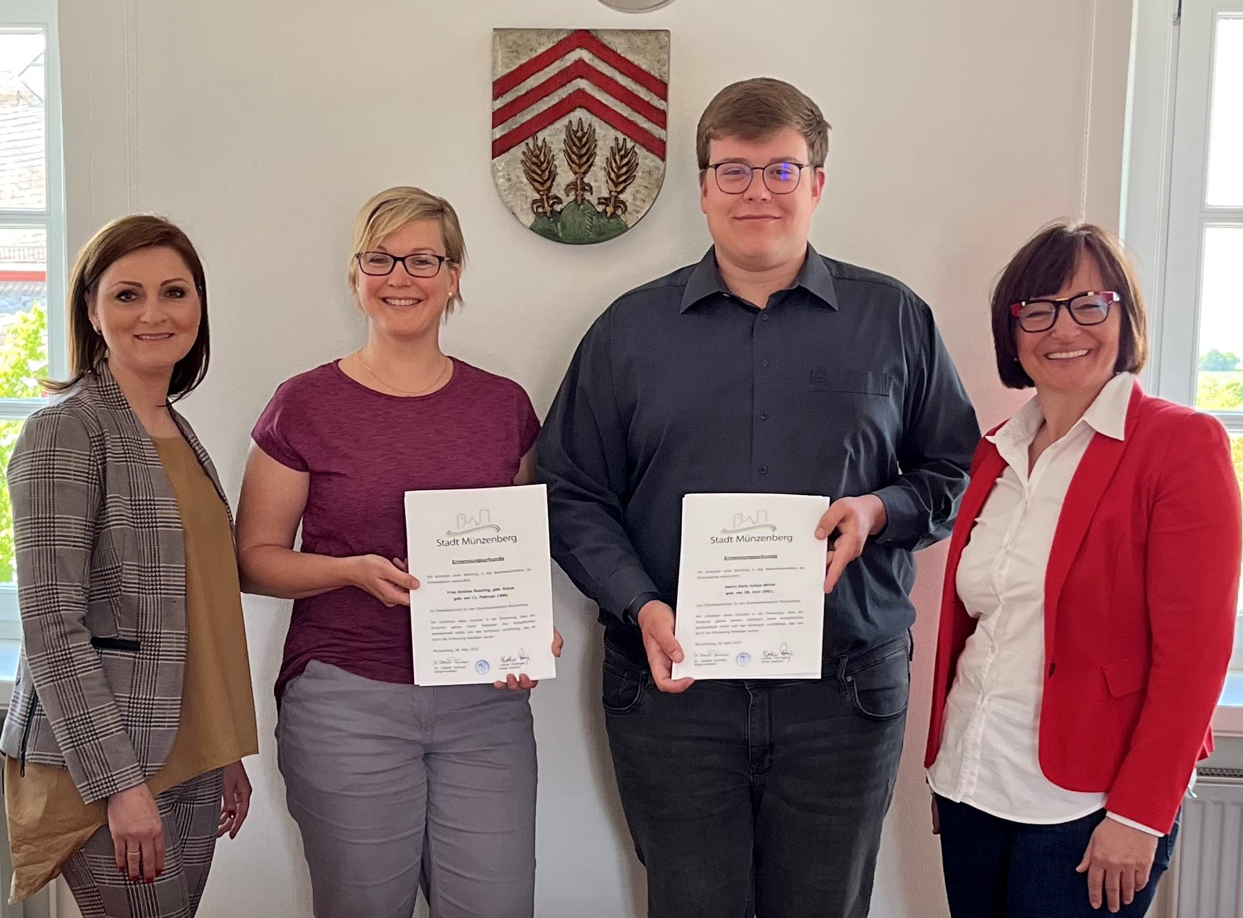 Freud und Leid dulden manchmal keinen Aufschub. Die Erledigung standesamtlicher Vorgänge zu Trauungen, Geburten und Sterbefällen müssen verlässlich gewährleistet werden. Hierbei unterstützen sich die beiden Kommunen Rockenberg und Münzenberg seit 01. Oktober 2020 partnerschaftlich. Damit die interkommunale Zusammenarbeit auf diesem Gebiet erfolgen darf, berechtigen die Kommunen wechselseitig ihre Standesbeamtinnen und Standesbeamten zu standesamtlichen Arbeiten im jeweiligen Standesamtsbezirk – offizieller Amtseid inklusive. Die jüngste Verstärkung für das gemeinsame Team kommt aus Rockenberg. Andrea Ruschig und Felix Wirth legten den Amtseid ab und erhielten von Bürgermeisterin Dr. Isabell Tammer ihre Ernennungsurkunden für den Standesamtsbezirk Münzenberg. Ab sofort dürfen die beiden Amtshandlungen auch für den Standesamtsbezirk Münzenberg vollziehen. Die beiden Bürgermeisterinnen Olga Schneider und Dr. Isabell Tammer (außen li u. re) freuen sich über den Ausbau der interkommunalen Zusammenarbeit im Fachbereich Standesamt.