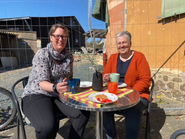 Baustellenbedingt ist der Außenbereich des Kulturcafés derzeit eher rustikal. Die Angebote laufen aber ganz normal. So freut sich das Kulturcafé Nebenan mittwochs und sonntags auf Gäste, die in und vor der Obergasse 70 Kaffee und selbstgebackenen Kuchen genießen möchten. Vorsitzende Silke Appel (links) und Gabi Sickel (rechts) haben es sich vor dem Bauzaun gemütlich gemacht.
