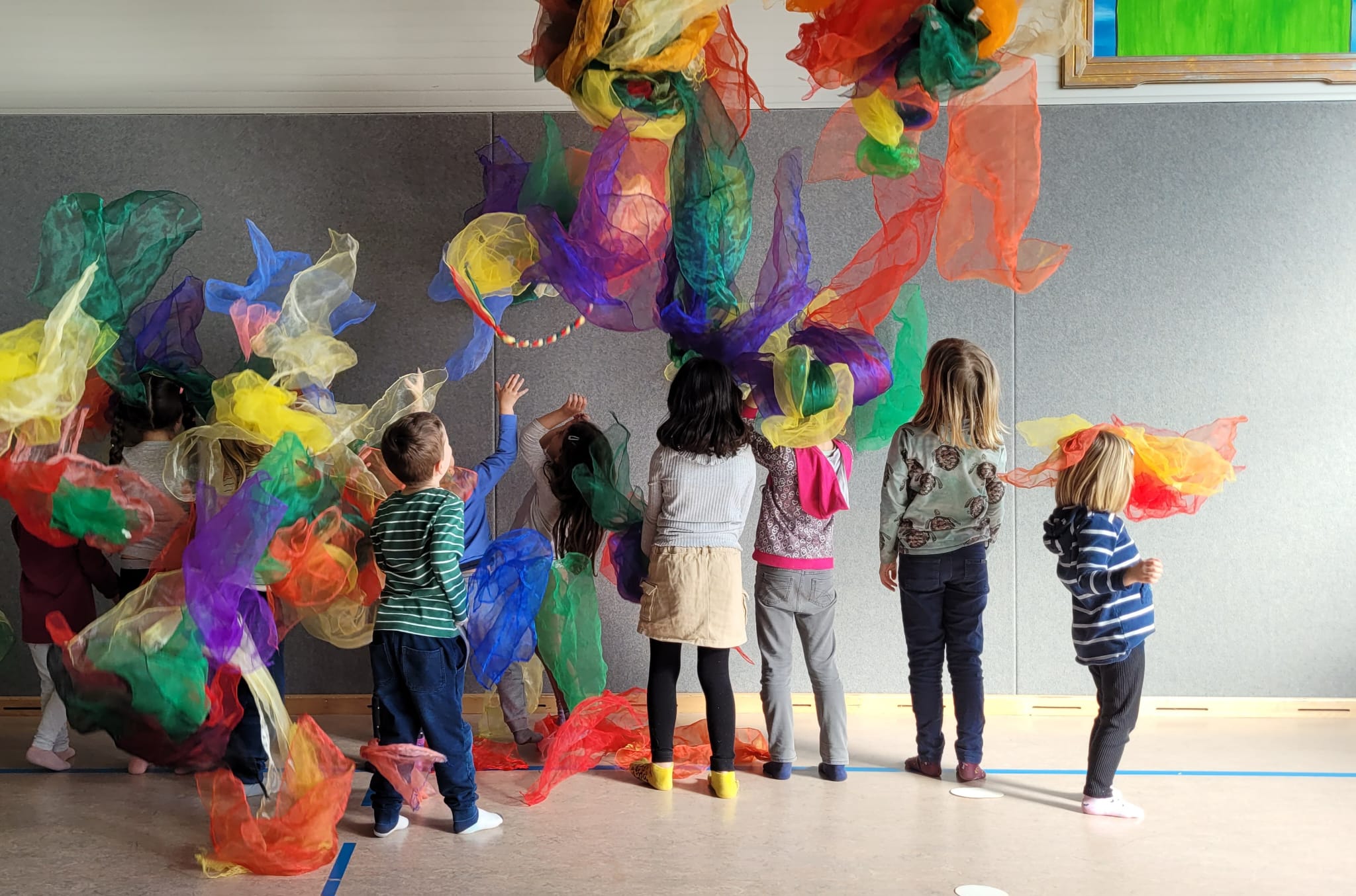 Schwerelos und magisch sieht das Spiel mit den bunten Tüchern aus. Das ist nur eine von vielen Aktivitäten aus dem Spiel- und Tanz Projekt unter der Leitung von Tanja Mack (Kita Kinderbrücke). Im Rahmen der Kooperation von Kitas und Schule findet das Projekt wird für Kita- und Schulkinder wöchentlich im Ganztag in der Johanniterschule am Standort Gambach statt. Die Kinder entscheiden mit, welche Aktivitäten, Tänze und Musik gewählt werden. Künftig gestaltet Kooperationbeauftragte Joeline Wirth das Spiel- und Tanz Projekt gemeinsam mit Tanja Mack und den AG-Kindern.