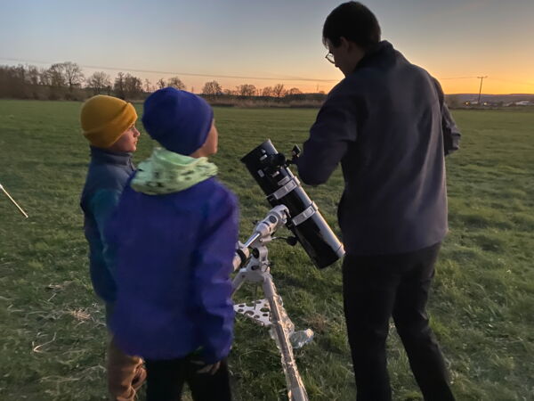 Einen coolen Abend im wahrsten Sinn des Wortes erlebten die Teilnehmenden der ersten Münzenberger Astronomie-Nacht. Jens und Luca Cornelius, beide Mitglieder des Teams Sozial des Deutschen Roten Kreuzes (DRK) in Münzenberg, hatten für ihre Veranstaltung im Rahmen des diesjährigen OSTERFEZ der Stadt Münzenberg beste Bedingungen. Keine Wolke trübte den sternenklaren Nachthimmel. Auf der Wiese vor dem Sportplatz in Ober-Hörgern konnten so alle einen Blick auf Planeten und Sterne werfen. Mond, Jupiter, Mars, der Orionnebel und der offene Sternenhaufen der Plejaden schienen zum Greifen nah. Dieses Erlebnis ließ niemanden kalt und die eisigen Nachttemperaturen waren schnell vergessen. Klaus Spruck und Hans Norbert Gries von der Astronomischen Arbeitsgemeinschaft Heuchelheim erklärten und zeigten ein Stück der an diesem Abend sichtbaren unendlichen Weiten des Weltraums. Sehr anschaulich erläuterte Klaus Spruck die Dimensionen der Entfernungen, zum Beispiel zwischen Erde und Saturn, und hatte dafür eigens ein Modell der Erde im Maßstab von 1cm zu 1.000 km mitgebracht. „Das heißt, die Strecke vom Erd-Modell mit seinen 12 cm Durchmesser auf dem Sportplatz Ober-Hörgern zum gedachten Saturn-Modell mit seinem dem Größenverhältnis angepassten 116 cm Durchmesser auf dem Butzbacher Schrenzerbad entspricht der tatsächlichen Entfernung zwischen Erde und Saturn“, so Spruck.