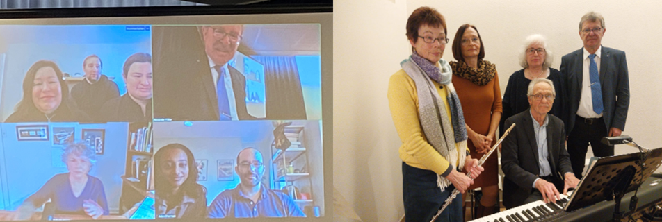 Linkes Bild: Ann Sherman (oben links) und Fern Shumer Chapman (unten links), die Töchter von Gerda Katz und Edith Westerfeld, waren als Ehrengäste zur Gedenkveranstaltung der Stadt Münzenberg und des Freundeskreises Burg und Stadt Münzenberg anlässlich der Reichspogromnacht aus den USA zugeschaltet. Dies sorgte für sehr bewegende Eindrücke.