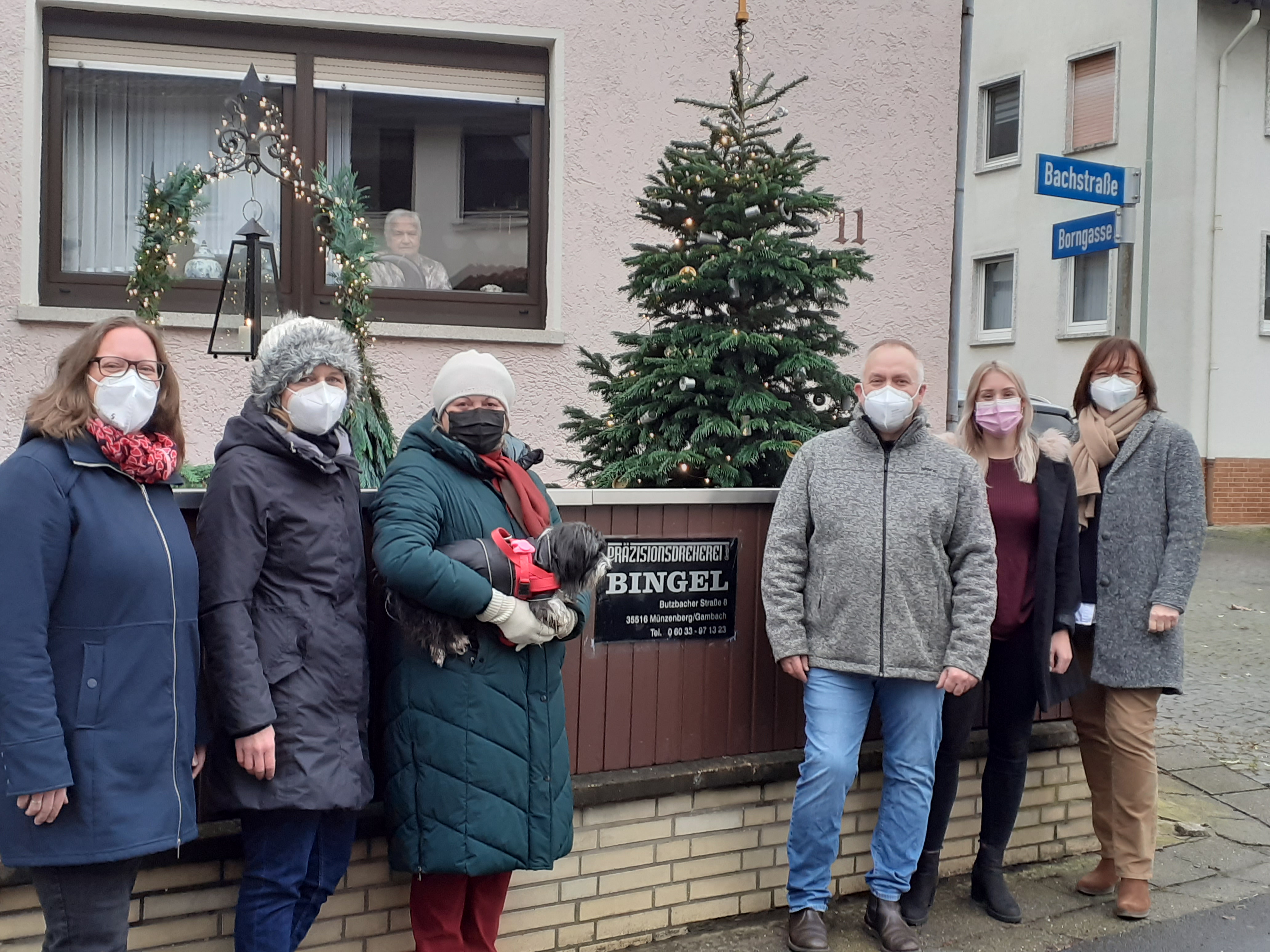 Silke Appel, Adventskalender-Initiatorin Anne Lehrl und Waldtraud Brüggemann vom Verein „Nebenan – Das Kulturcafé Gambach e.V.“ freuen sich mit Lutz und Elin Bingel (Präzisionsdreherei Bingel) mit Bürgermeisterin Dr. Isabell Tammer (alle von links) über den gelungenen Start des zweiten Gambacher Adventskalenders.