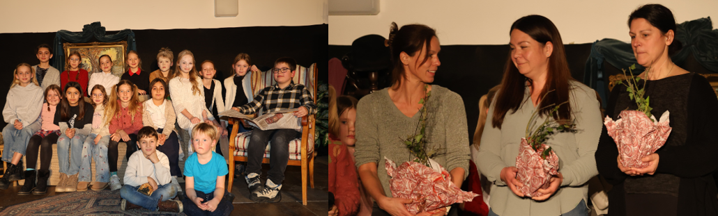 Mit stehenden Ovationen bedankte sich das applausfreudige Publikum ganz herzlich bei der Jungen Bühne. Die Kinder ließen es sich nicht nehmen, ihren Regisseurinnen mit kleinen Geschenken und lieben Worten ebenfalls ihren Dank auszusprechen. Abschließend schlossen sich die beiden Vereinsvorsitzenden Heike Sames und Uwe Müller mit lobenden Worten und kleinen Gaben an. Sie dankten allen, die zu dem Erfolg der Theateraufführungen beigetragen haben: den Bühnenbauerinnen und -bauern, dem Beleuchter, den Verpflegungs- und Planungsteams und vielen anderen mehr … und natürlich auch dem Tontechniker „Justus“, der auch das Unmögliche möglich gemacht hat.