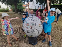 Nachdem die Gruppen C und D der Münzenberger Ferienspiele in den letzten Tagen bereits große Vorarbeit geleistet und 8 riesige Pappmaché-Kugeln aus Luftballons, Kleister und Zeitungspapier gebaut haben, gingen heute die Gruppen A und B ans Werk.