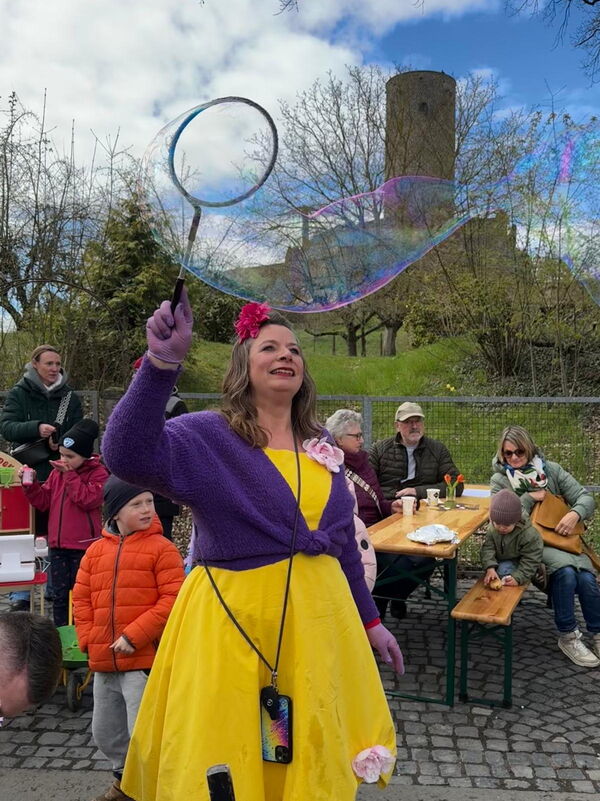 Seifenblasenkünstlerin Christiane Alles faszinierte mit ihren Darbietungen und zauberte großen und kleinen Besuchern des Münzenberger Frühlingsmarktes ein Lächeln ins Gesicht.