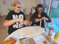 Unter dem Titel „Scary Tuesday“ bereiteten die Jugendlichen ein außergewöhnliches Buffet mit Skelett-Keksen, Spinnen-Crackern und Mumienwürstchen zu. Besonders schaurig wurde die selbst gemachte grün-blaue Bowle mit Gummi-Pythons und Mandarinenstücken. Während ein Teil der Gruppe gemeinsam backte, schnitzte Justin noch einen gruseligen Kürbis. Dieser ziert nun den Eingang des Jugendzentrums. Auch passende, düstere Schminke durfte nicht fehlen.